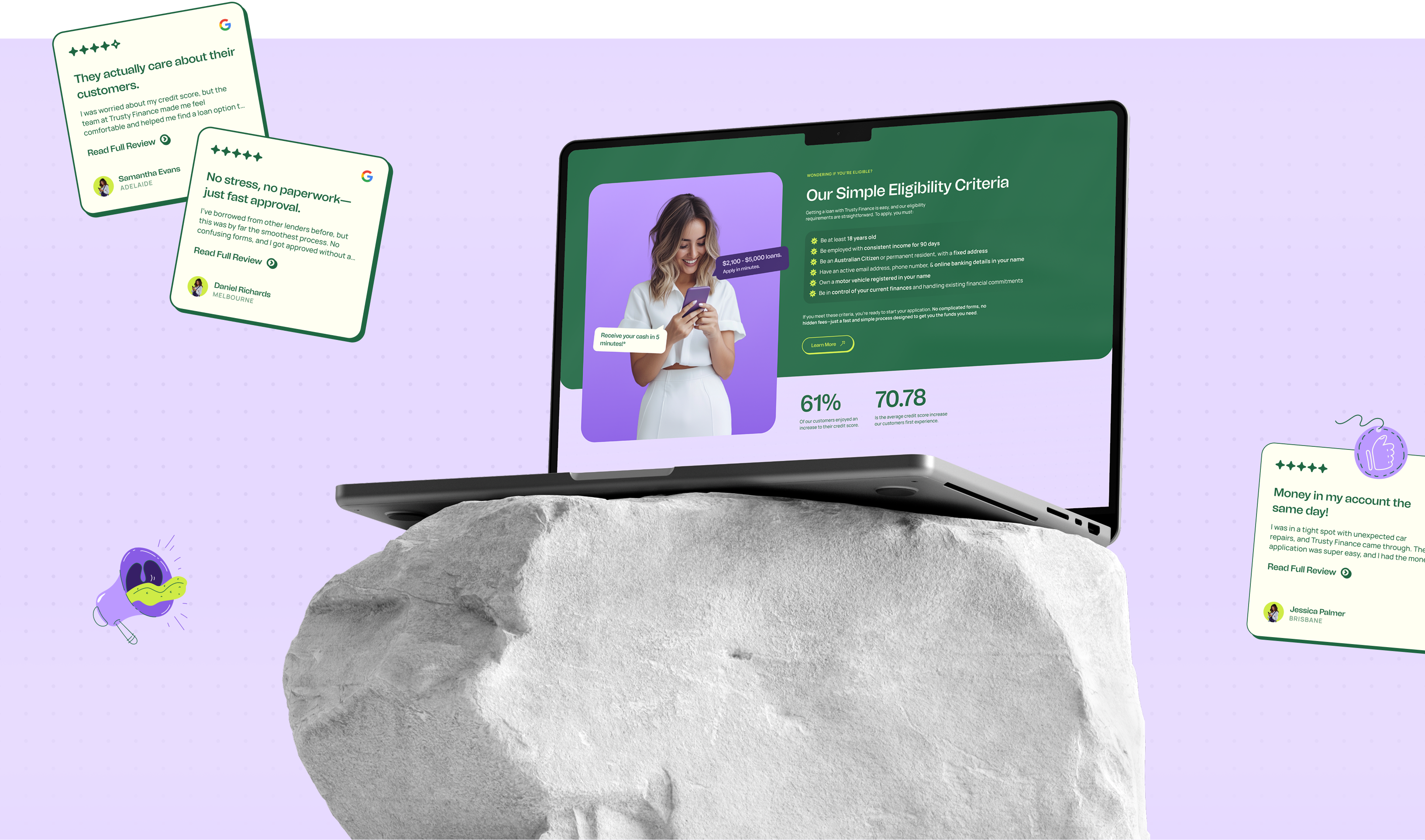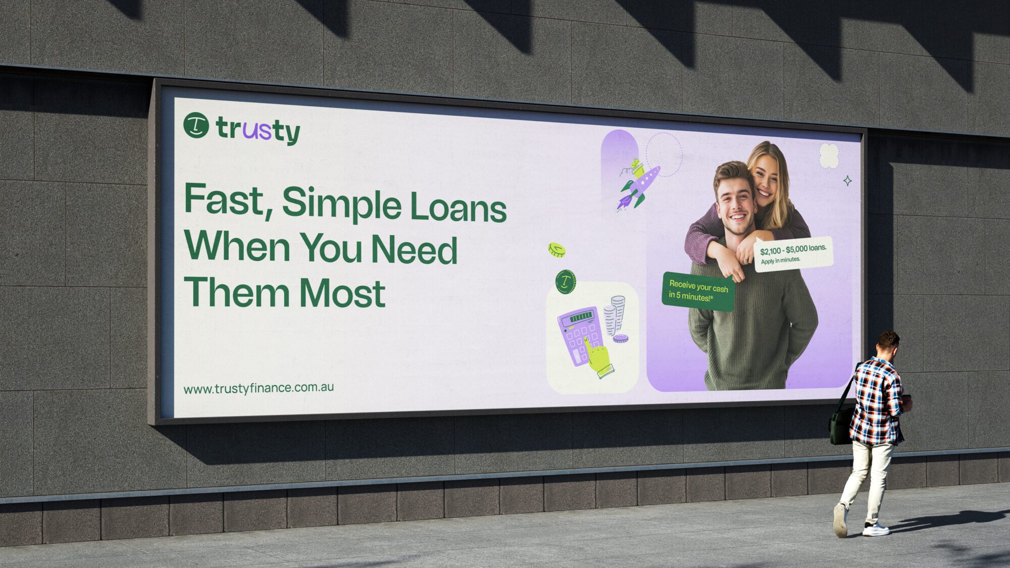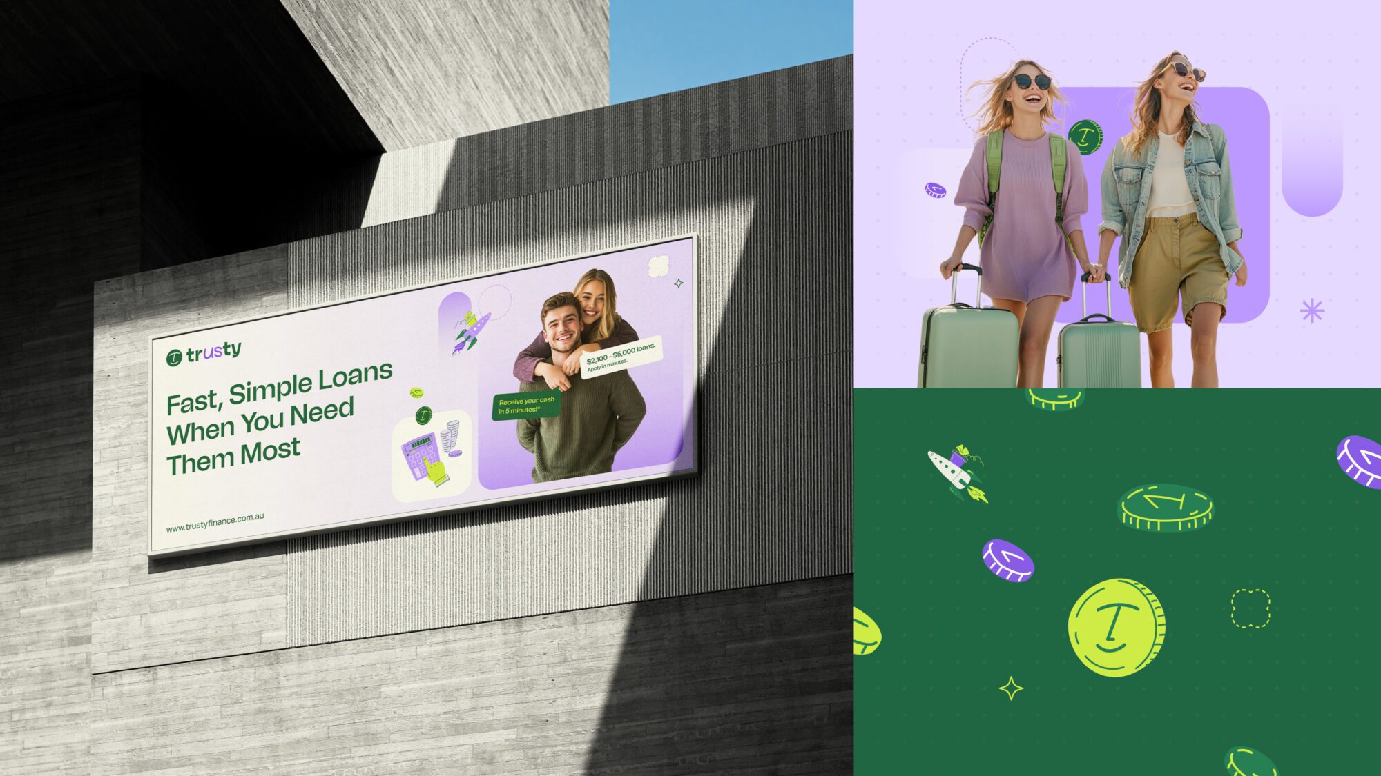 Through our discovery process with Trusty Finance, we explored the foundations of what the brand needed to be, not just visually but emotionally. We worked closely to define who their customers are: primarily younger Australians, tech-savvy, often underserved by traditional finance and seeking speed, clarity and transparency in how they access funds. We explored how those customers wanted to feel – respected, empowered and reassured – while avoiding the cold, corporate tones that plague the finance sector. Being a new player in the market, Trusty needed to feel like a modern solution, fast access to cash without the typical hassles or red tape. Our challenge was to build a brand that felt as reliable as a bank but far more human.