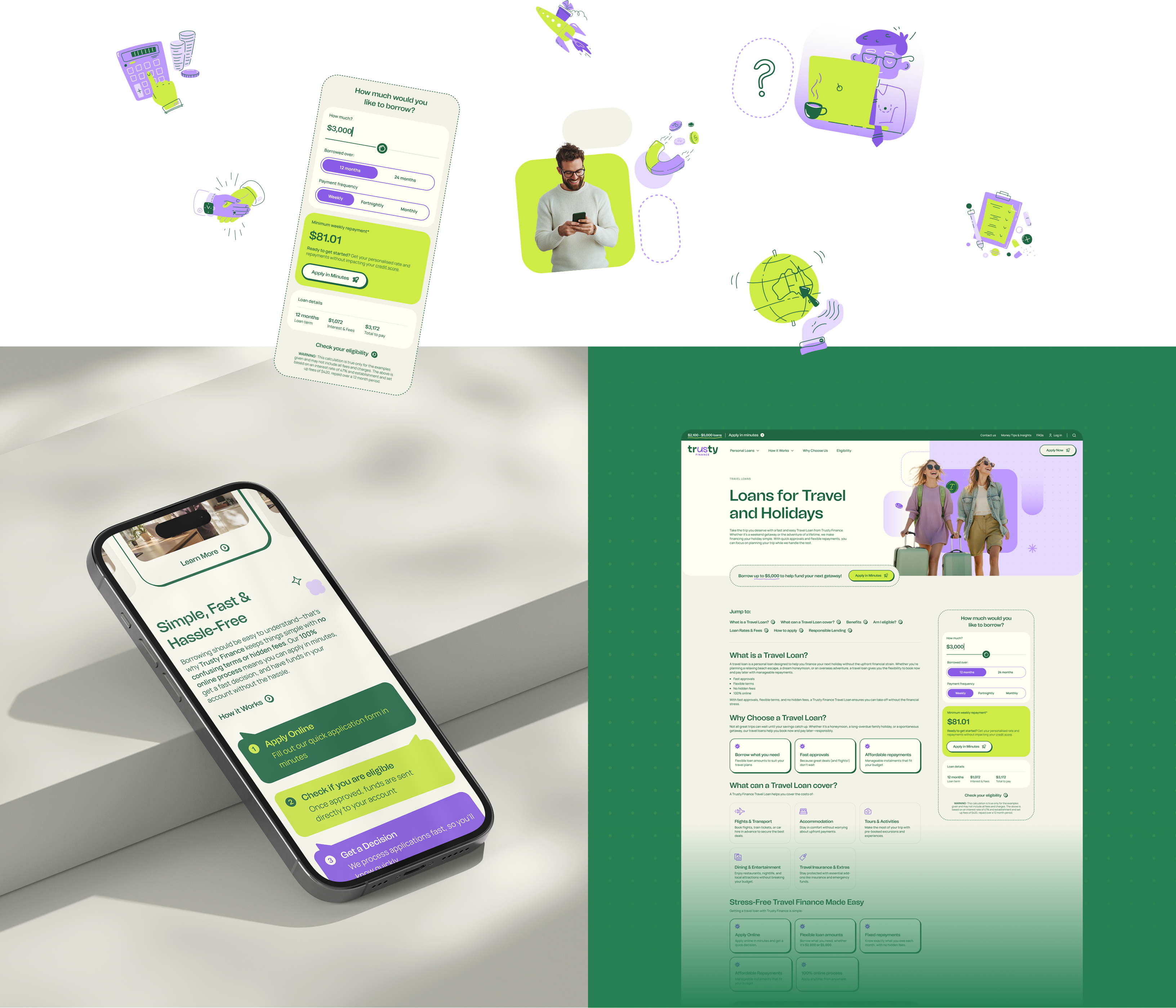 Our approach to branding Trusty focused on bringing humanity and warmth into every visual cue. We highlighted the “us” in “Trusty” through a distinct type treatment that reinforces connection and inclusivity. Hand-drawn illustrations added a layer of playfulness and authenticity, creating a distinct voice that stood apart from conventional finance brands. To further connect with their audience, we blended these visual elements with a suite of relatable photography that captures the everyday moments of their demographic. The result is a brand that’s confident yet friendly, sharp yet approachable.